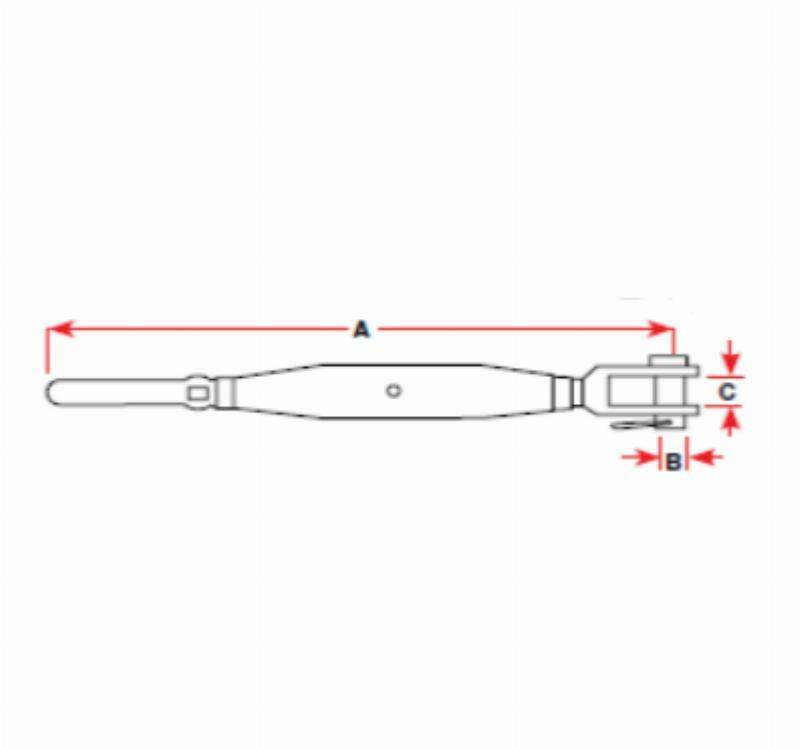 316 grade stainless steel turnbuckle in miniature size with fork one end and swage terminal the other end.