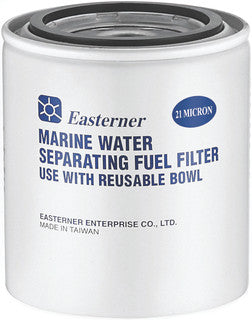 Water separating fuel filter with aluminium bowl, screw plug drain and 21 micron spin-on filter element. Gloss black coated die-cast aluminium filter head with white die-cast aluminium bowl. The filter head incorporates a mounting bracket. The filter media sheds water instead of absorbing it.