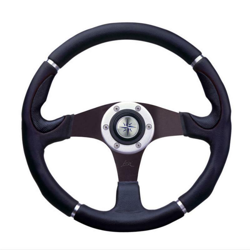 Stylish Italian made 3 spoke U.V. resistant polyurethane steering wheel in two toned black/black. Cast alloy hub, to suit a standard ¾" tapered shaft. Supplied complete with plastic centre cap and medallion.