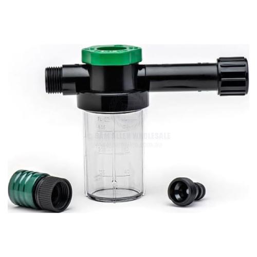 Inline hose-connect mixing unit for Salt-Away concentrate.