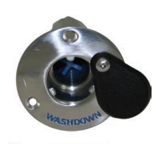 Crafted from durable cast 316 stainless steel, this heavy-duty quick connector is designed for easy handling with a larger easy grip hand grip on the straight plastic connector. The connector is clearly labelled "WASHDOWN" for quick identification.